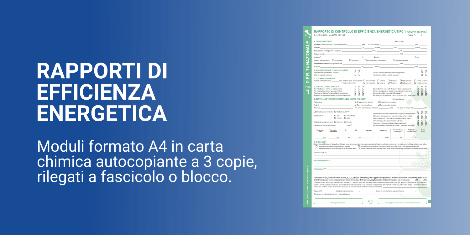 Il nostro store dispone di una serie completa di: libretti e rapporti conformi al DPR 74/2013; rapporti di manutenzione conformi alle normative UNI10435 e UNI10436; registri per le apparecchiature F-gas; libretti di uso e manutenzione apparecchi a gas; rapporti di lavoro; accordi di manutenzione; cartelline portadocumenti per il cliente; etichette; rotoli in carta termica per stampati portatili; etc…