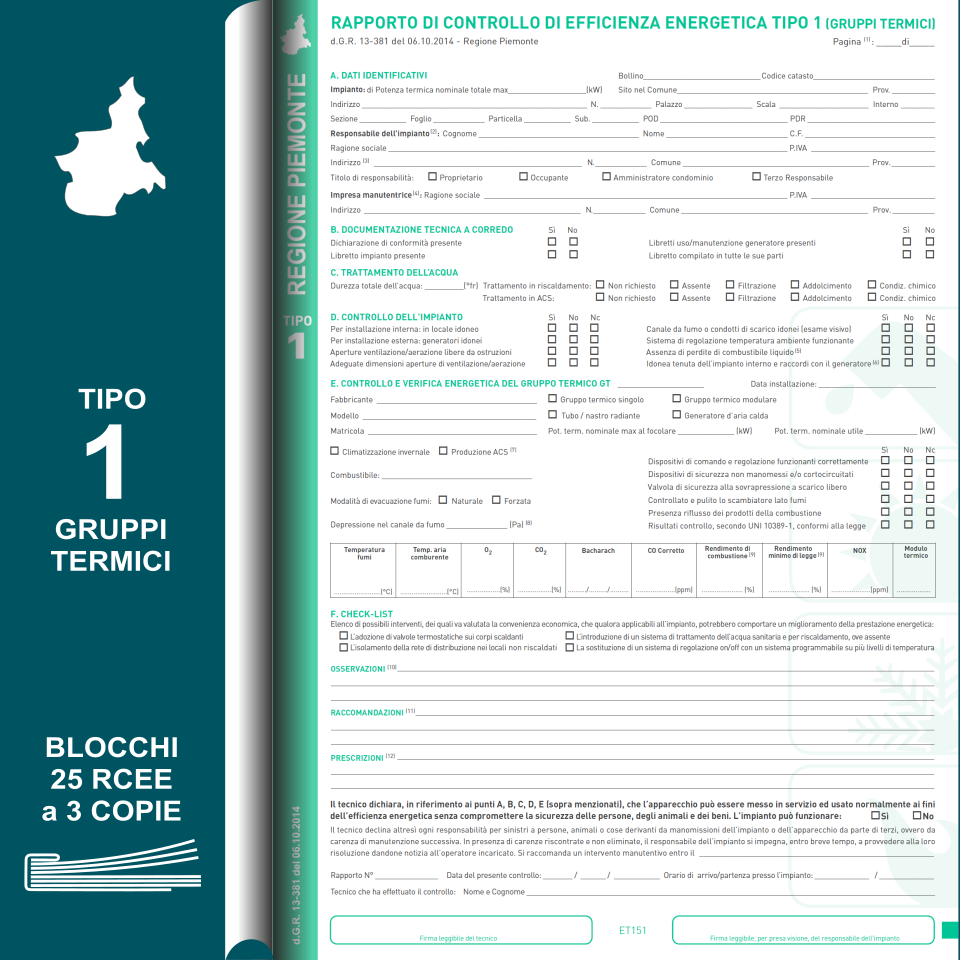 Blocco composto da 25 Rapporti di Controllo Tipo 1 (Gruppi Termici) su carta chimica 3 copie in formato A4.