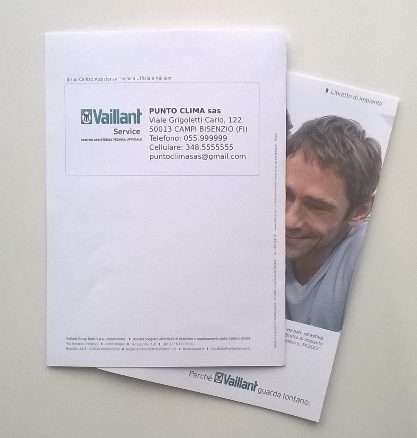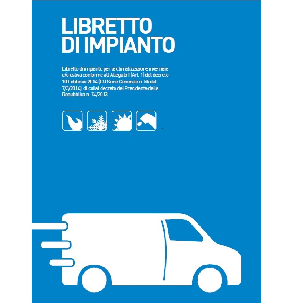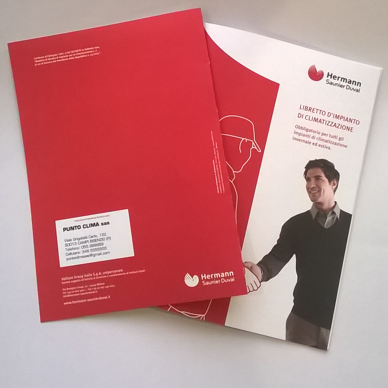 Libretto in formato A4 con copertina TOP da gr.140 . Ogni libretto è composto da 24 pagine che riportano le schede pertinenti ad un impianto di climatizzazione invernale ed estiva normalmente presente nelle singole unità abitative , più la scheda copiativa . Ogni libretto è personalizzato in quadricromia con loghi i dati del centro assistenza.