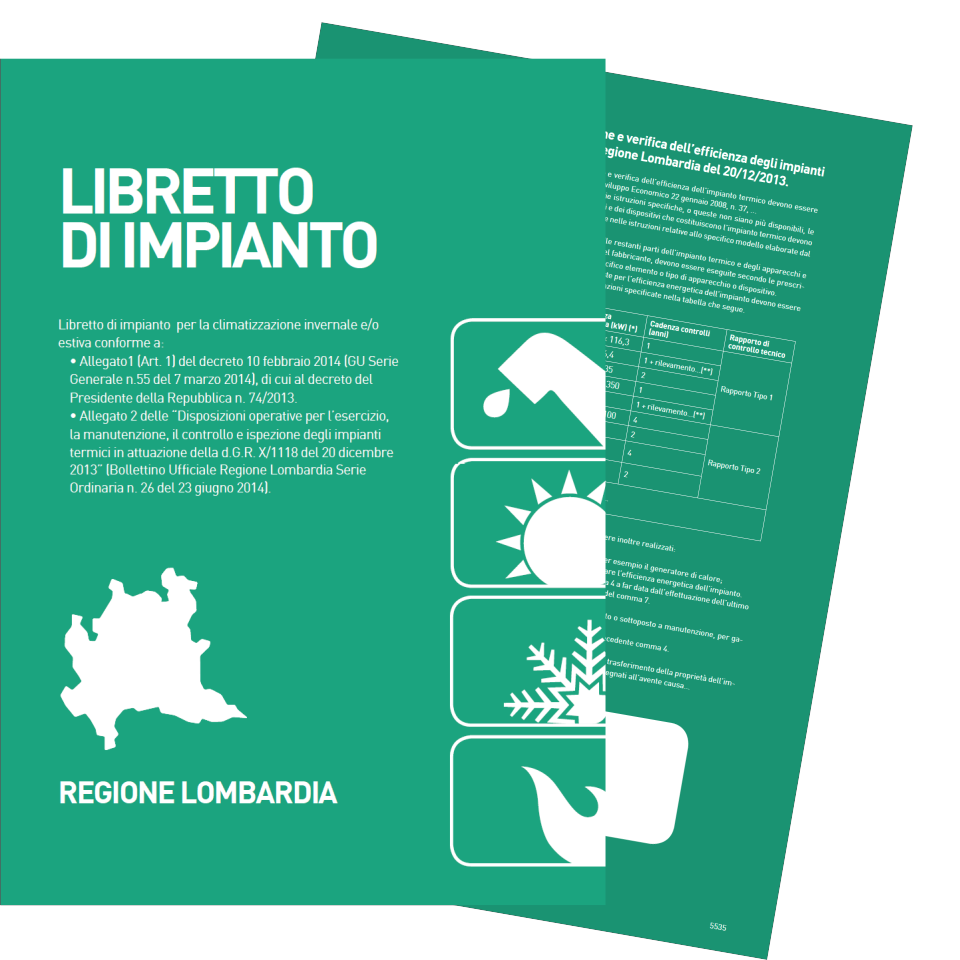 Elegante libretto in formato A4 con copertina colorata e spazio sul retro per l’applicazione di timbro o adesivo aziendale. Ogni libretto è composto da 48 pagine che riportano tutte le schede previste dal D.P.R. 74/2013, con una disposizione ottimizzata alle principali esigenze del parco installato.