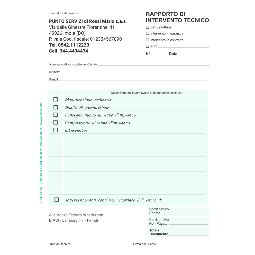 Blocco composto da 40 Rapporti di intervento su carta chimica 2 copie in formato 22,5 x 15 Personalizzati solo con testi in B/N