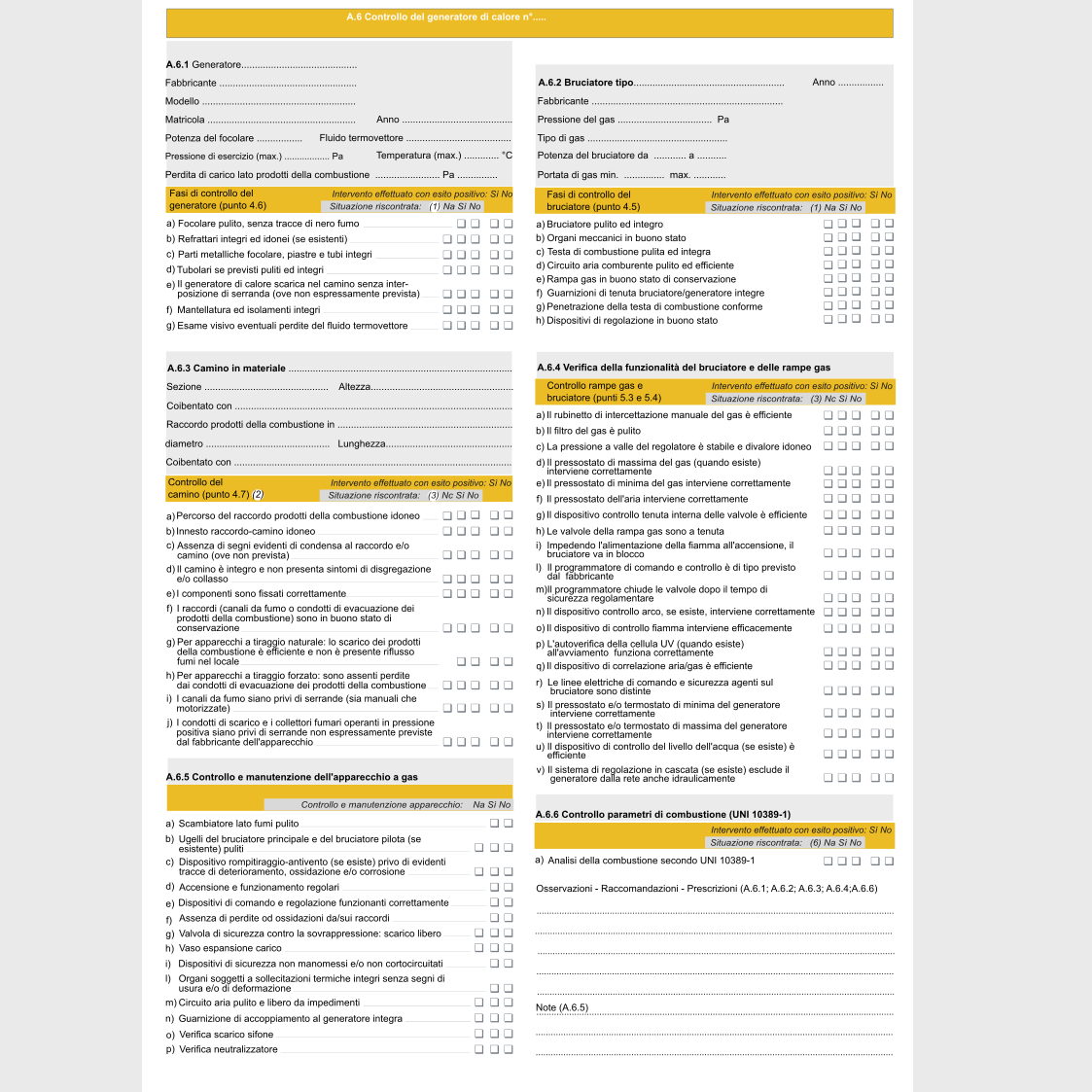 Aggiornato alla norma UNI 10436:2019, permette di documentare il controllo e manutenzione sugli apparecchi alimentati a gas di portata termica nominale superiori ai 35 kW.