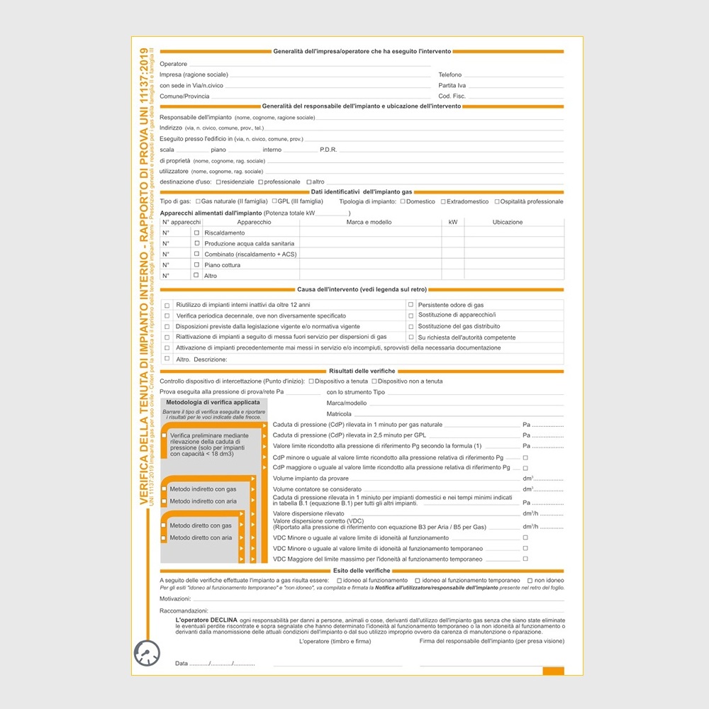 Rapporto di verifica della tenuta di impianto interno, conforme alla norma UNI 11137:2019, rilegato in blocchi da 35 rapporti a 2 copie.